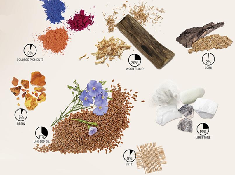 Linoleum is met zijn samenstelling van 98% natuurlijke (biologische en mineralen) ingrediënten de meest milieuvriendelijke vloer uit ons assortiment. Het bevat ook gerecyclede content, is 100% recyclebaar en past daarmee volledig in de circulaire economie.